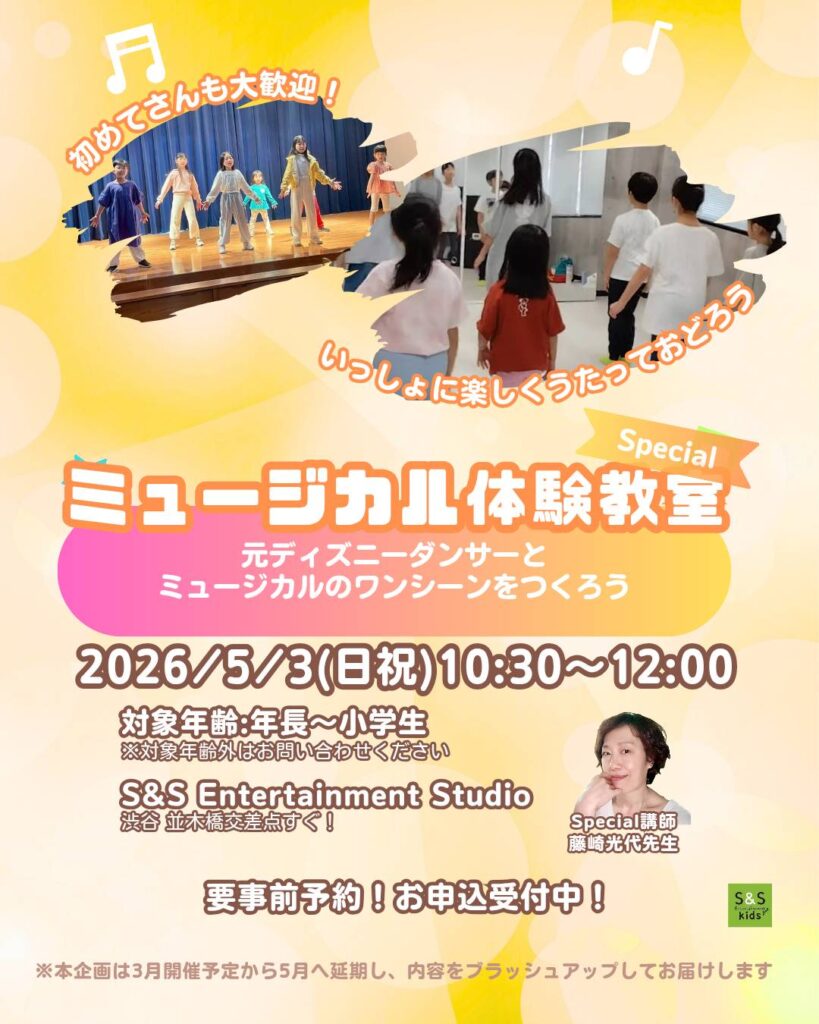 本ワークショップは3月開催予定から5月へ延期し、内容をブラッシュアップして開催いたします。3月にてお申込、ご検討いただいておりました皆さまには心よりお詫び申し上げます。 ミュージカル体験教室Special 元 ディズ Read more about ミュージカル体験教室Special、開催!(5月3日)[…]