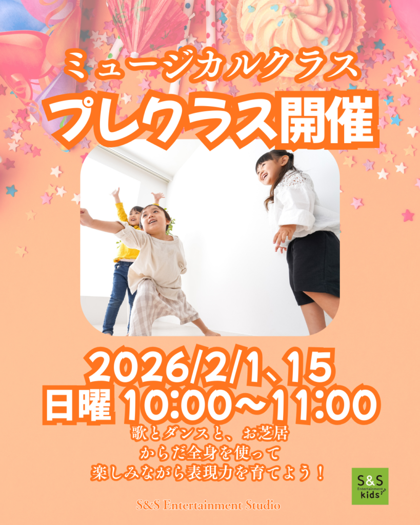 2026年4月にスタートする新設「ミュージカルクラス」に向けて、プレクラス(事前体験レッスン) を開催します! 新設「ミュージカルクラス」 🟠ミュージカルクラスとは? 「表現って楽しい!」を育てる、初めてのミュージカル Read more about 【新クラス開講】プレクラス開催!ミュージカルクラス[…]